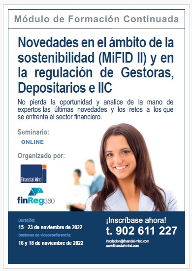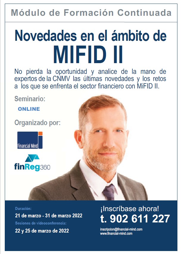 Curso On-line - Sesiones Zoom 21, 24 y 28 septiembre 2021 Fecha de inicio 20/09/2021 Conozca de la mano de expertos de la CNMV y de finReg360 las importantes novedades incorporadas en el Anteproyecto de Ley del Mercado de Valores y de los servicios de inversión, y en sus tres Reales Decretos [...]